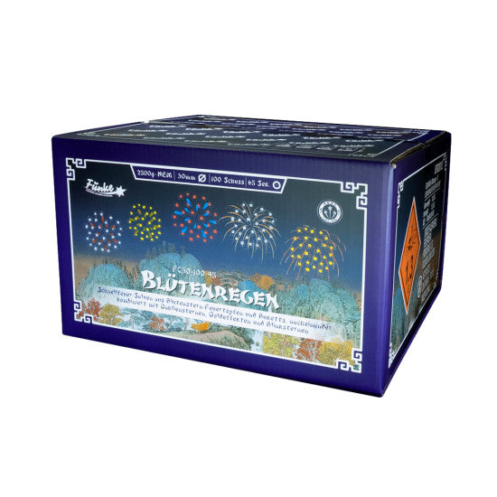 100 Schuss Verbund im Kaliber 30mm, mit Schnellfeuer-Salven aus Blütenstern-Feuertöpfen und Buketts, nacheinander kombiniert mit Dahliensternen, Goldeffekten und Blinksternen.