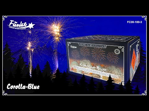 Sortiment aus Batterien mit rasant geschossenen blauen Feuertöpfen zu Corolla-Schweifaufstieg und blauen Buketts mit Corollaweiden, mit abschließender Finalsalve.