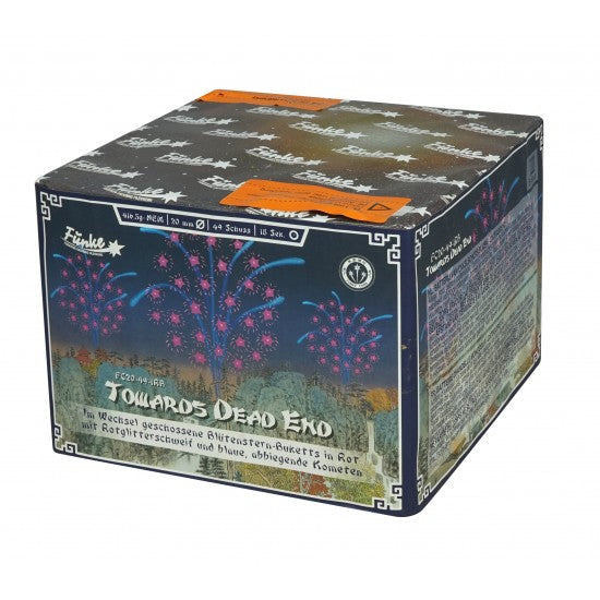 Im Wechsel geschossene Blütenstern Buketts in Rot mit Rotglitter-Schweif und blaue, abbiegende Kometen