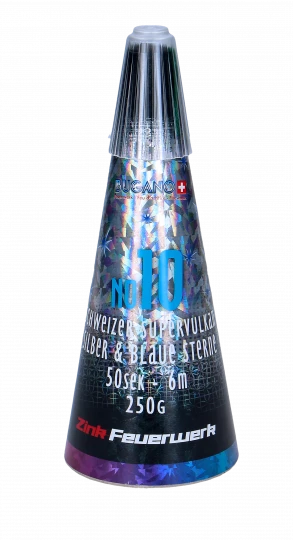 Schweizer Supervulkan (Made in Swiss by Bugano) No.10 Aqua, zu Beginn mit blauer Bengalphase und anschließend Verwandlung zu gleißenden Silbertitanfunken kombiniert mit blauen Sternen.Der Vulkan überzeugt durch Perfektion in Herstellung und Verarbeitung und durch Steighöhe, Brenndauer und Effektkombination. Die Brenndauer des Vulkans beträgt ca. 50s, die Effekthöhe steigert sich bis auf 6m. Mit 250g NEM reizt dieser Vulkan die maximal zulässige Effektmasse aus - mehr geht nicht!
